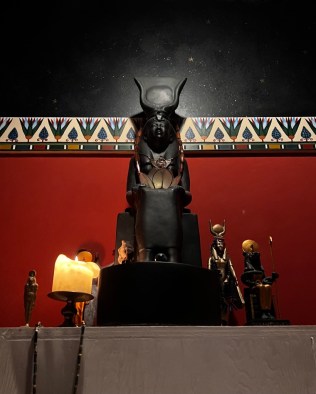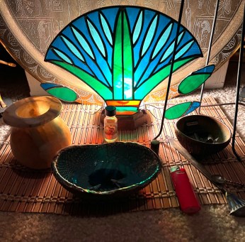 I enter Her shrine, light the candles, ignite the charcoal in the censer, pour Nile Water into the cup. The stillness of the morning settles in the shrine and in me. I sit on the floor before Her sacred image, looking up at Her.